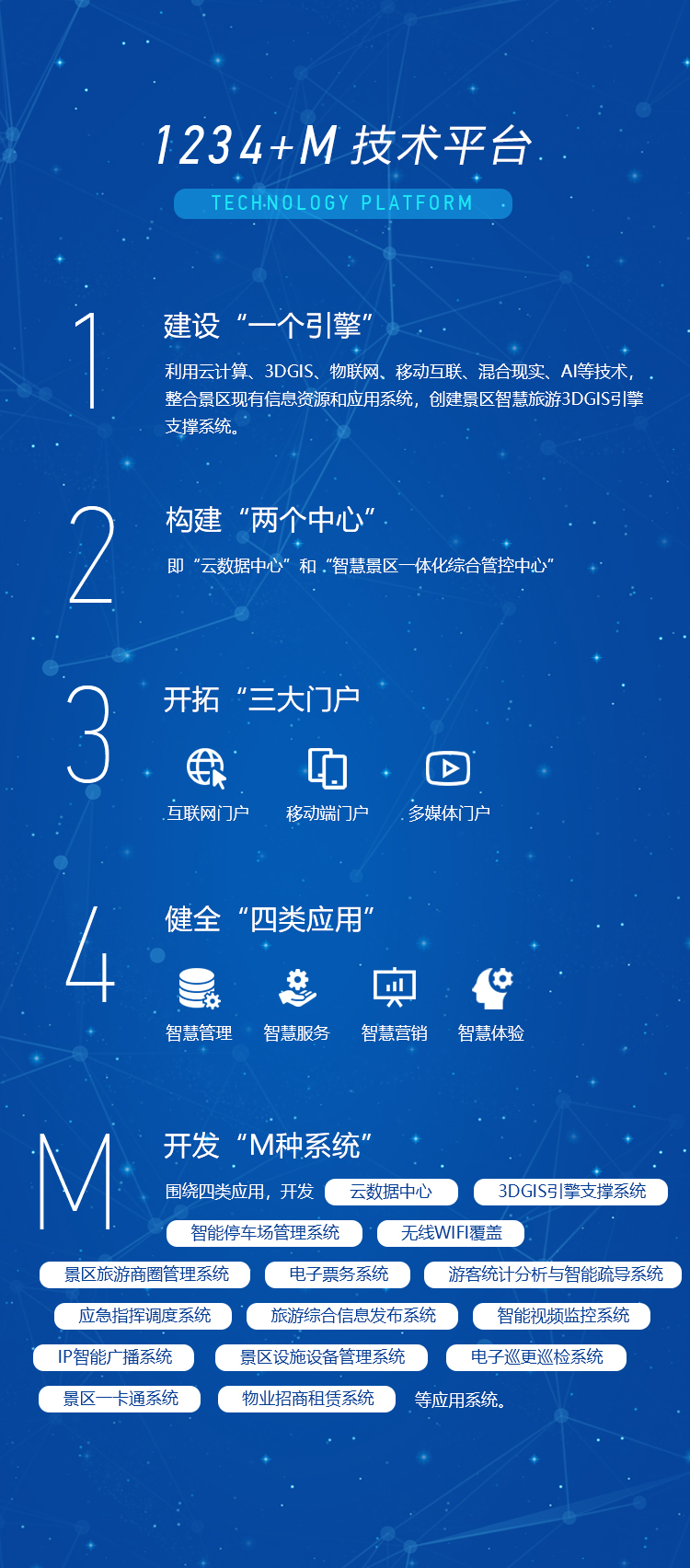 云野科技結(jié)合多年智慧景區(qū)建設(shè)經(jīng)驗(yàn)及自身研發(fā)的成熟產(chǎn)品,緊緊圍繞“智慧管理、智慧服務(wù)、智慧營銷與智慧體驗(yàn)”四類應(yīng)用,通過“1234+M”技術(shù)平臺(tái)的實(shí)施,實(shí)現(xiàn)景區(qū)智慧旅游建設(shè)目標(biāo)。
