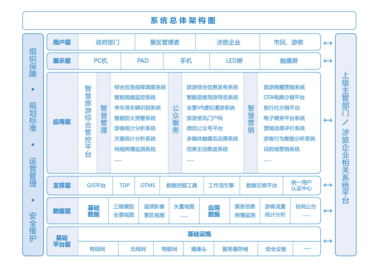 以云數(shù)據(jù)中心平臺(tái)為基礎(chǔ),以地理信息GIS平臺(tái)為支撐,以組織保障、標(biāo)準(zhǔn)規(guī)范、運(yùn)維管理與安全保障為后盾,從綜合管理、游客服務(wù)與旅游營銷三大層面入手,采用互聯(lián)共享、融合提升和科學(xué)管理的先進(jìn)設(shè)計(jì)理念,逐步建立起特色鮮明、運(yùn)轉(zhuǎn)高效的智慧旅游管理體系、服務(wù)體系和營銷體系。