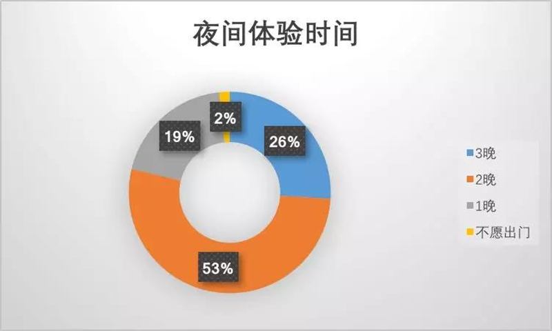 根據(jù)旅游統(tǒng)計,國內(nèi)旅游平均停留時間為3天,連續(xù)3晚愿意體驗夜游的受訪者達(dá)到26%,選擇2晚的受訪者占到53%,不愿出游的受訪者僅占2%,人均夜游停留時間為2.03晚。說明未來一段時間內(nèi),游客夜游意愿強(qiáng)烈,夜游市場需求廣闊,隨著夜游產(chǎn)品的豐富多元和夜游環(huán)境的日臻完善,未來夜游需求將持續(xù)旺盛,市場潛力巨大。