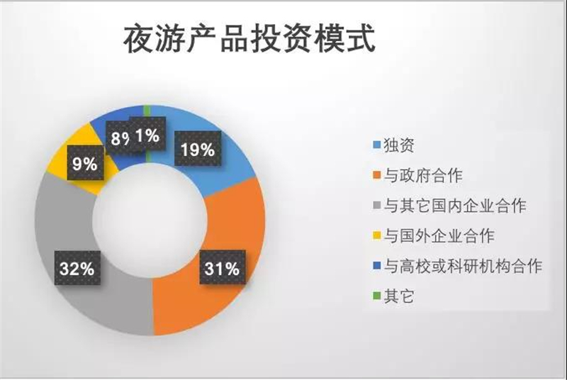 專項調(diào)查數(shù)據(jù)顯示,參與調(diào)研的657家旅游企業(yè)中,夜游產(chǎn)品投資規(guī)模在5%以下的企業(yè)占比23%,投資規(guī)模在6%-10%的企業(yè)占比28%,投資規(guī)模在10%-20%的企業(yè)占比26%,投資規(guī)模超過30%的企業(yè)占22%。投資模式方面,旅游企業(yè)更傾向與政府合作(30.7%)或與國內(nèi)其他企業(yè)合作(32.6%),獨(dú)資(18.7%)或與國外企業(yè)合作(9.1%)其次,7.9%的企業(yè)愿意與高?;蚩蒲袉挝缓献?。