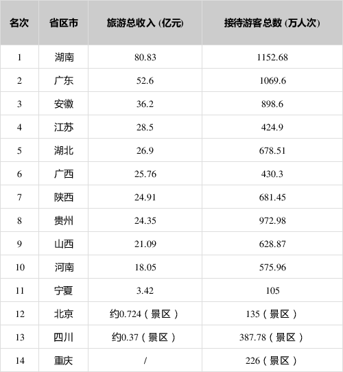 根據(jù)排行榜中的數(shù)據(jù)顯示,湖南以80.83億元列旅游總收入排行榜第一名,旅游總收入超過50億元的2省份分別為湖南和廣東,8省份接待游客總數(shù)超過500萬人次,分別是湖南、廣東、貴州、安徽、陜西、湖北、山西和河南。》》》查看其他排行情況