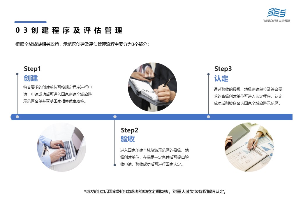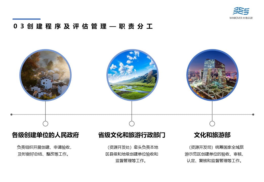 根據(jù)全域旅游相關(guān)政策,示范區(qū)創(chuàng)建及評(píng)估管理流程主要分為3個(gè)部分:即創(chuàng)建——驗(yàn)收——認(rèn)定。各級(jí)創(chuàng)建單位的人民政府,負(fù)責(zé)組織開展創(chuàng)建、申請(qǐng)驗(yàn)收,及時(shí)做好總結(jié)、整改等工作;省級(jí)文化和旅游行政部門牽頭負(fù)責(zé)本地區(qū)縣級(jí)和地級(jí)創(chuàng)建單位驗(yàn)收和監(jiān)督管理等工作;文化和旅游部統(tǒng)籌國家全域旅游示范區(qū)創(chuàng)建單位的驗(yàn)收、審核、認(rèn)定、復(fù)核和監(jiān)督管理等工作。