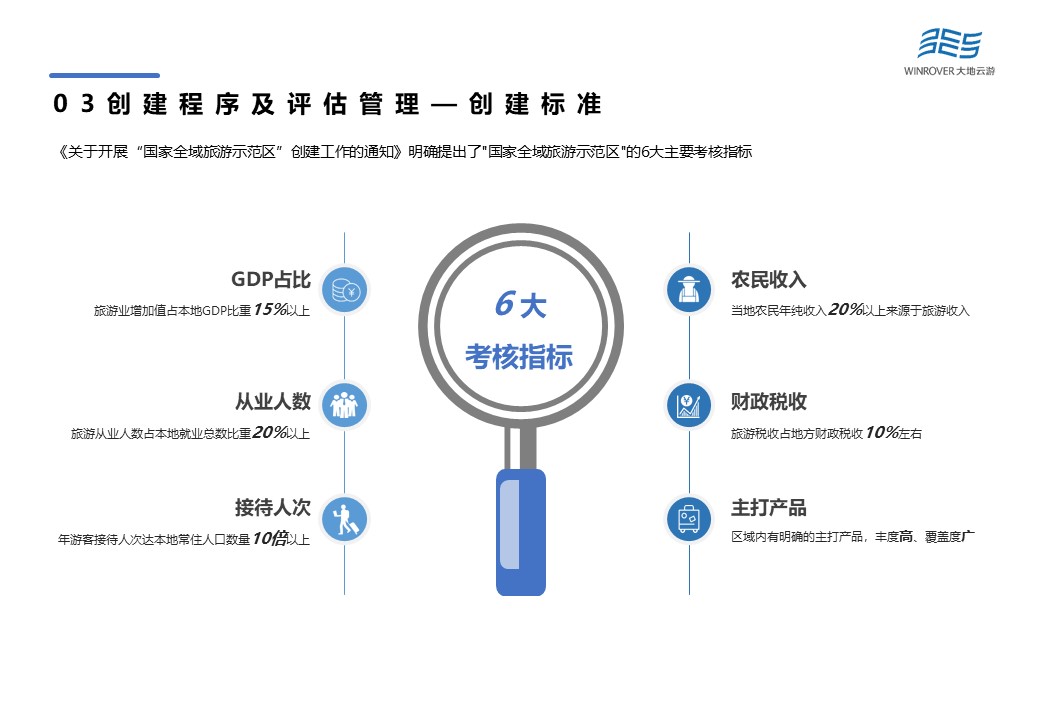 根據(jù)規(guī)定,各地首批申報(bào),原則上不超過10%左右的縣(含縣級(jí)市),有條件省份可適當(dāng)申報(bào)市(地州)為創(chuàng)建對(duì)象。創(chuàng)建主體為縣、市地州人民政府?!蛾P(guān)于開展“國家全域旅游示范區(qū)”創(chuàng)建工作的通知》明確提出了“國家全域旅游示范區(qū)”的6大主要考核指標(biāo)包括:GDP占比、從業(yè)人數(shù)、接待人次、農(nóng)民收入、財(cái)政稅收以及主打產(chǎn)品。