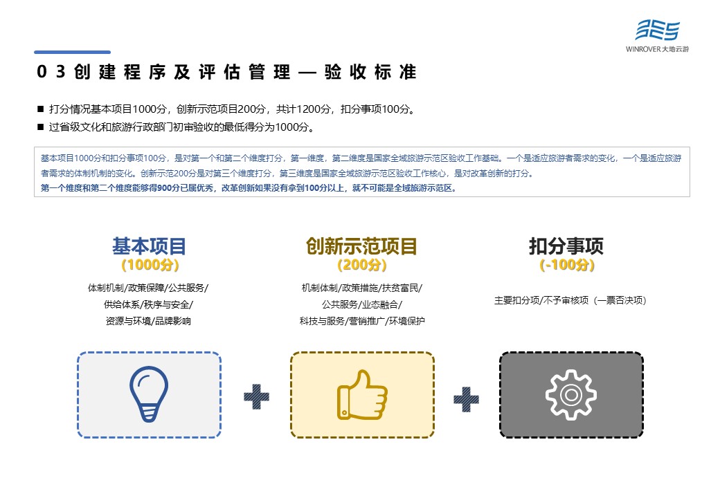 驗(yàn)收標(biāo)準(zhǔn)打分包含基本項(xiàng)目1000分,創(chuàng)新示范項(xiàng)目200分,以及扣分事項(xiàng)100分。其中,基本項(xiàng)目與扣分事項(xiàng)是國家全域旅游示范區(qū)驗(yàn)收工作基礎(chǔ)。一個(gè)是適應(yīng)旅游者需求的變化,一個(gè)是適應(yīng)旅游者需求的體制機(jī)制的變化。而創(chuàng)新示范項(xiàng)目是國家全域旅游示范區(qū)驗(yàn)收工作核心,是對(duì)改革創(chuàng)新的打分?;卷?xiàng)目與扣分事項(xiàng)能夠得900分已屬優(yōu)秀,改革創(chuàng)新如果沒有拿到100分以上,就不可能是全域旅游示范區(qū)。