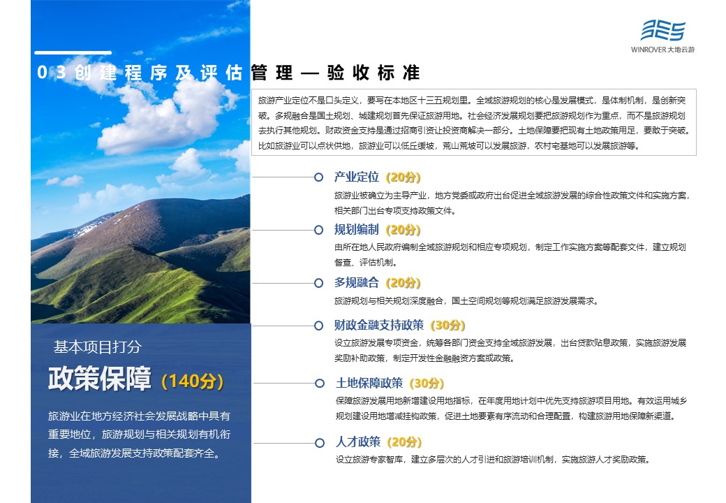 文化和旅游部以省級(jí)文化和旅游行政部門上報(bào)的縣級(jí)、地級(jí)創(chuàng)建單位的初審驗(yàn)收?qǐng)?bào)告等材料為認(rèn)定參考依據(jù),組織召開專家評(píng)審會(huì)對(duì)體制機(jī)制、政策保障、公共服務(wù)、供給體系、秩序與安全、資源與環(huán)境、品牌影響以及創(chuàng)新示范等8個(gè)方面進(jìn)行會(huì)議評(píng)審。根據(jù)最新修訂結(jié)果,認(rèn)定標(biāo)準(zhǔn)在供給體系方面進(jìn)行了適當(dāng)“放寬”,將“具有不少于1個(gè)國家5A級(jí)旅游景區(qū),或國家級(jí)旅游度假區(qū),或國家級(jí)生態(tài)旅游示范區(qū);或具有2個(gè)以上國家4A級(jí)旅游景區(qū)”修改為“具有不少于1個(gè)國家5A級(jí)景區(qū),或國家級(jí)旅游度假區(qū),或國家級(jí)生態(tài)旅游示范區(qū);或具有2個(gè)以上國家4A級(jí)景區(qū);或具有2個(gè)以上省級(jí)旅游度假區(qū);或具有1個(gè)國家4A級(jí)旅游景區(qū)和1個(gè)省級(jí)旅游度假區(qū)?!?/p>