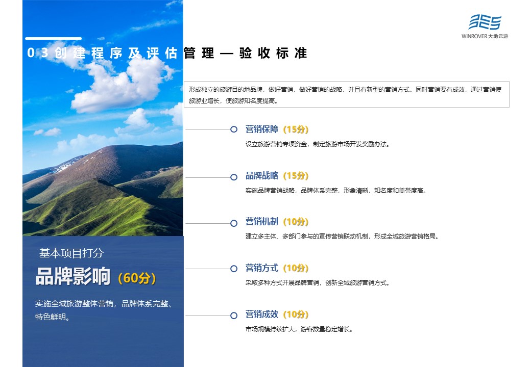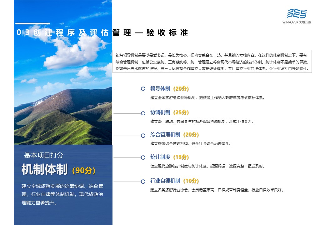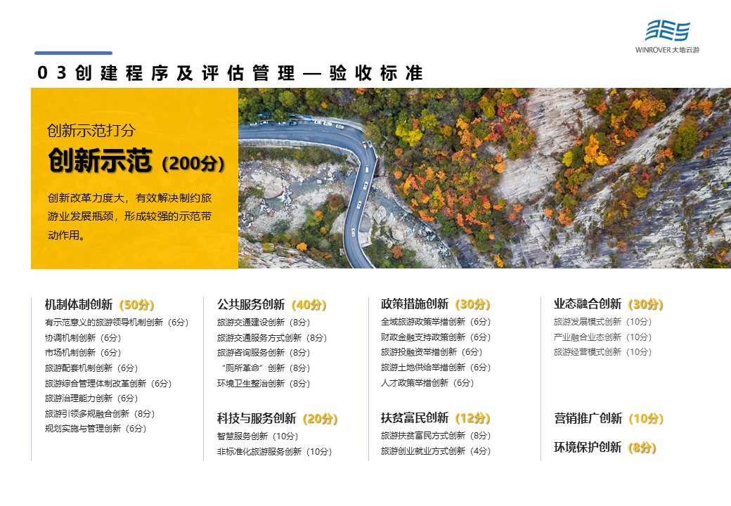 創(chuàng)新示范項(xiàng)目由機(jī)制體制創(chuàng)新(50分)、公共服務(wù)創(chuàng)新(40分)、科技與服務(wù)創(chuàng)新(20分)、政策措施創(chuàng)新(30分)、扶貧富民創(chuàng)新(12分)、業(yè)態(tài)融合創(chuàng)新(30分)、營銷推廣創(chuàng)新(10分)以及環(huán)境保護(hù)創(chuàng)新(8分)等8項(xiàng)構(gòu)成。創(chuàng)新改革力度大,有效解決制約旅游業(yè)發(fā)展瓶頸,形成較強(qiáng)的示范帶動(dòng)作用,是驗(yàn)收得分的重點(diǎn)。