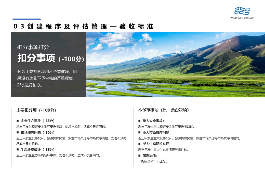 審核通過的國家全域旅游示范區(qū)縣級(jí)創(chuàng)建單位、地級(jí)創(chuàng)建單位所轄區(qū)縣和直轄市所轄區(qū)縣創(chuàng)建單位,由省級(jí)文化和旅游部制定驗(yàn)收實(shí)施方案,包括暗訪、明查、會(huì)議審核三種方式。根據(jù)驗(yàn)收得分結(jié)果確定申請(qǐng)認(rèn)定的創(chuàng)建單位,并形成初審驗(yàn)收?qǐng)?bào)告。