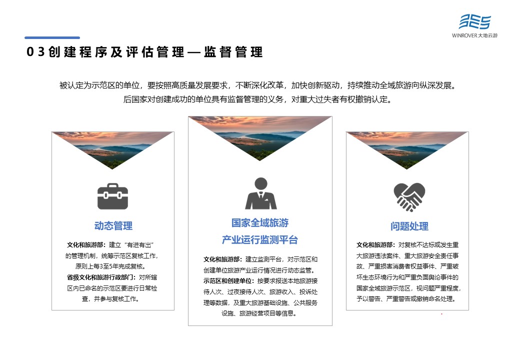 國家全域旅游示范區(qū)采用“有進(jìn)有出”的動(dòng)態(tài)管理機(jī)制,原則上每3至5年完成復(fù)核。被認(rèn)定為示范區(qū)的單位,要按照高質(zhì)量發(fā)展要求,不斷深化改革,加快創(chuàng)新驅(qū)動(dòng),持續(xù)推動(dòng)全域旅游向縱深發(fā)展,否則對(duì)重大過失者有權(quán)撤銷認(rèn)定。