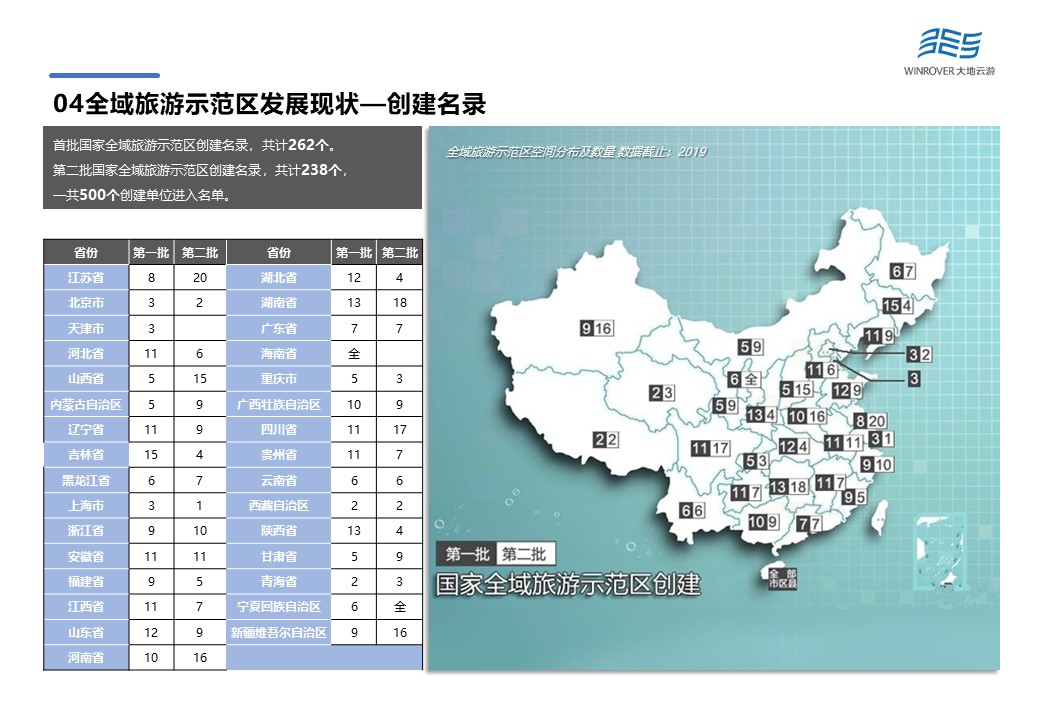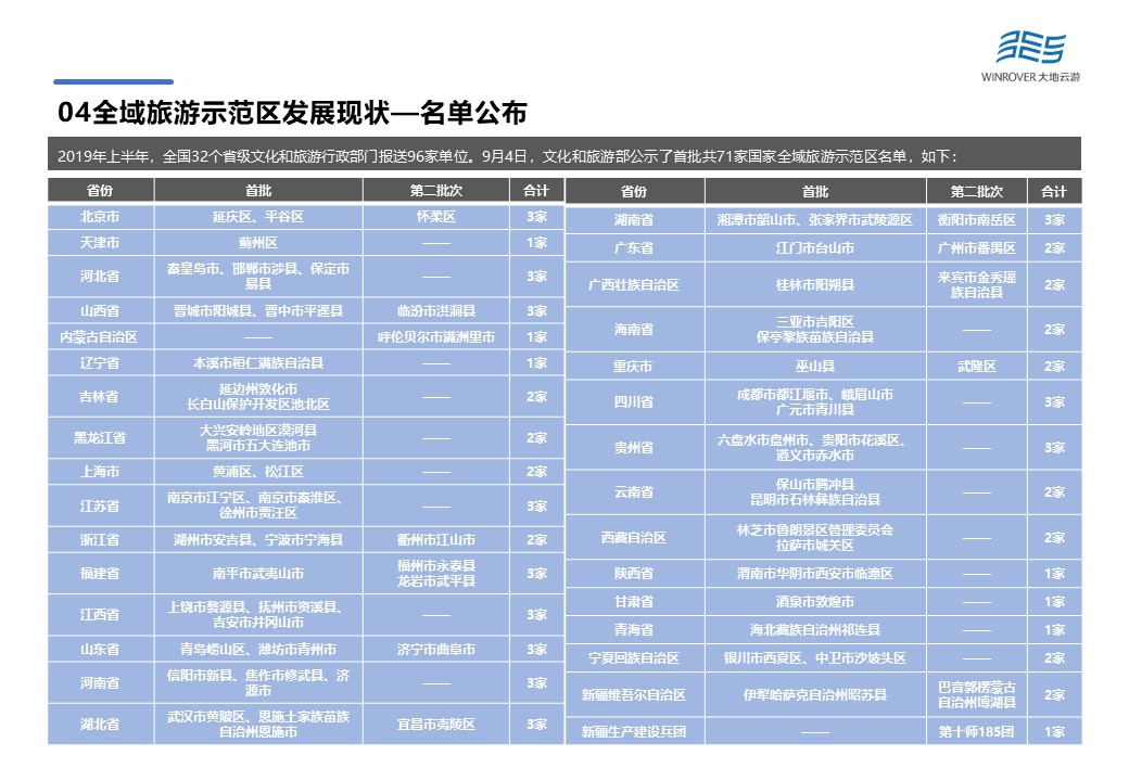 2019年上半年,全國32個(gè)省級(jí)文化和旅游行政部門報(bào)送96家單位。9月4日,文化和旅游部公示了首批共71家國家全域旅游示范區(qū)名單,大陸32個(gè)省市自治區(qū)均有1-3家全域旅游示范區(qū)。