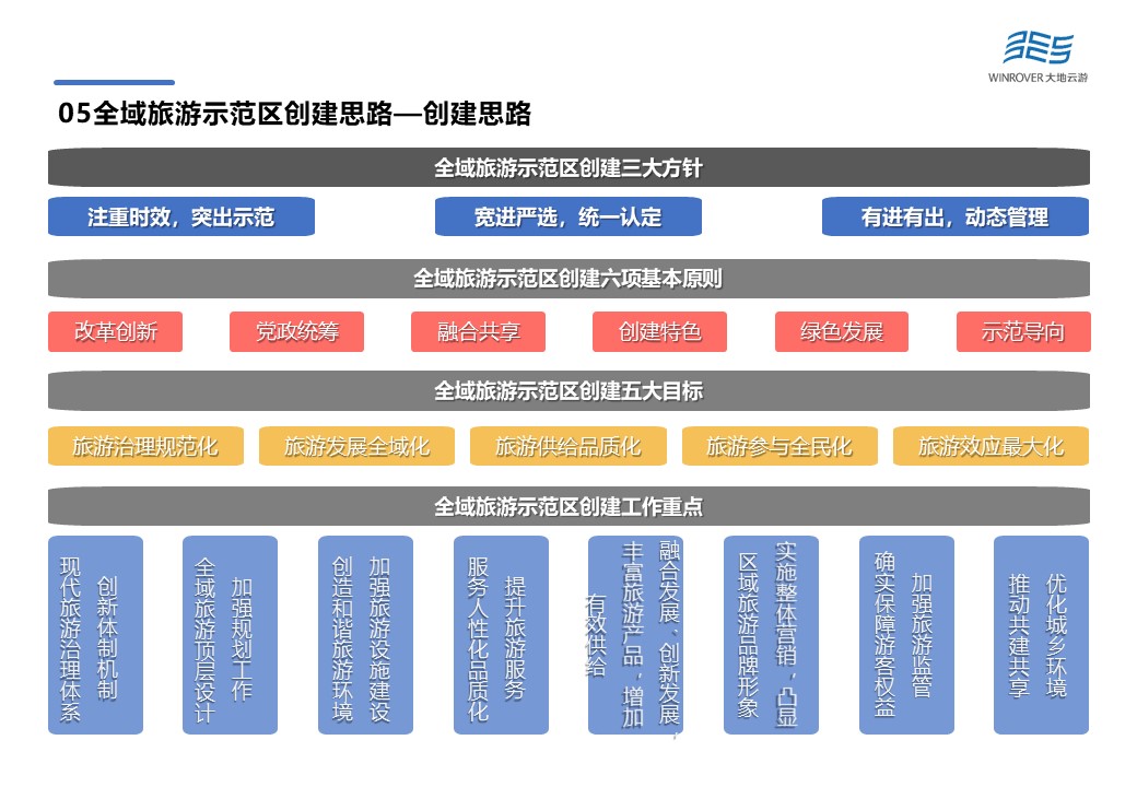 全域旅游的重點(diǎn)創(chuàng)建工作主要體現(xiàn)在創(chuàng)新體制機(jī)制、加強(qiáng)規(guī)劃工作、加強(qiáng)旅游設(shè)施建設(shè)、提升旅游服務(wù)、豐富旅游產(chǎn)品、豐富整體營銷、加強(qiáng)旅游監(jiān)管與優(yōu)化城鄉(xiāng)環(huán)境。