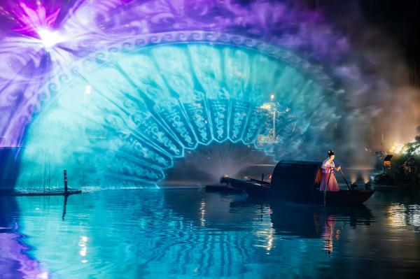 揚(yáng)州古運(yùn)河畔,全國(guó)首個(gè)全景式大型沉浸演藝“大運(yùn)揚(yáng)州”正在上演。游客乘船行進(jìn)中,五大歷史篇章通過(guò)聲、光、電、水、火、投影、機(jī)械、飛行器及伴行船等十余種手段次第展開(kāi)。3D Mapping秀將千年運(yùn)河史投射于真實(shí)水岸,游客仿佛穿越至隋唐漕運(yùn)的繁忙場(chǎng)景。而僅一街之隔的東關(guān)街上,《創(chuàng)世山海經(jīng)》數(shù)字藝術(shù)展正引發(fā)新熱潮——AR技術(shù)掃描書(shū)頁(yè),明代彩繪本中的神獸便“破卷而出”,九尾狐踏月而行,饕餮自巖壁躍出,配合5.1環(huán)繞聲效與地面互動(dòng)投影,打造“人在畫(huà)中游”的奇幻世界。