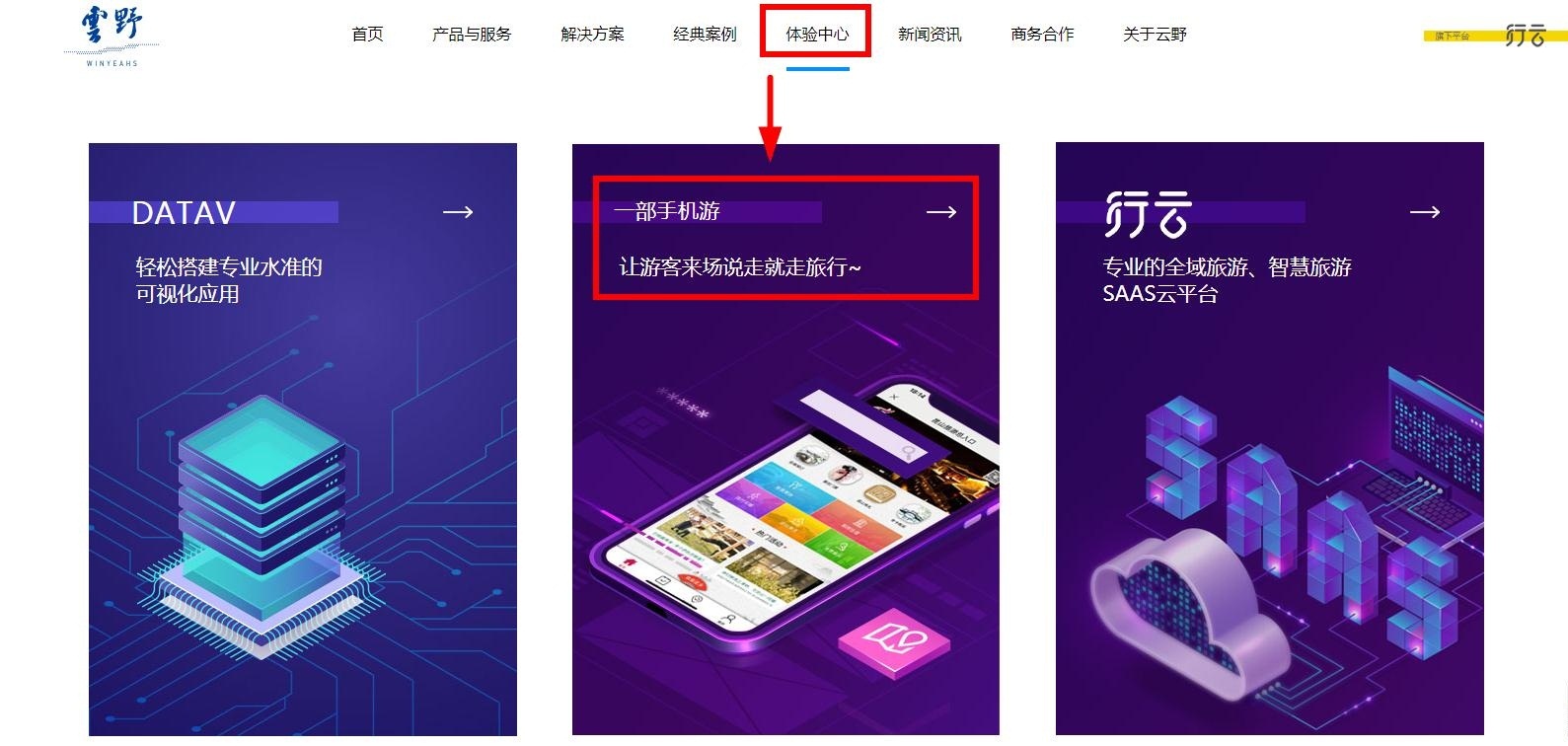 下面介紹下云野的“一部手機游”景區(qū)管理平臺軟件特色功能,如需要直接體驗的用戶可登入官網(wǎng)m.hl0hn.cn,點擊導(dǎo)航欄“體驗中心”-------- “一部手機游”即可體驗。
